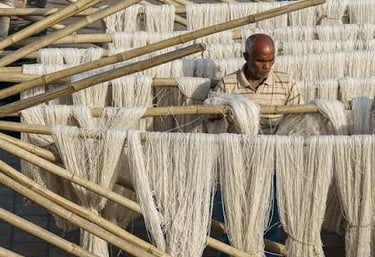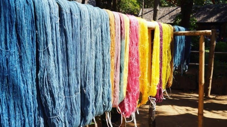 " Naturally dyed yarns air - drying, preserving color for timeless rugs." "After dyeing, the yarn rests under open air - an essential step in rugs making." "Hand - dyed yarn drying slowly to lock in rich, lasting hues,"